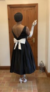 As soon as I saw the white bow on the back I knew it called for complete black and white accessories. Further more it would be enhanced by white satin evening gloves and of course sparkly glittery white shoes too.