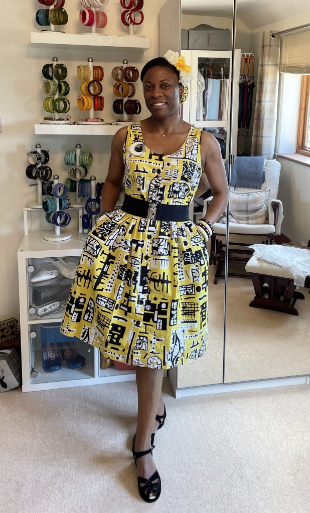 I loved it’s sleeveless fitted bodice, buttoned all the way down the front, with a gently gathered skirt, on sight as I know that’s a shape that flatters my figure. It, like all the range, is £55 which is a price tag that’s far lower than many of the other vintage reproduction brands. But I am so pleased to say that this has not meant Joanie has skimped on quality.